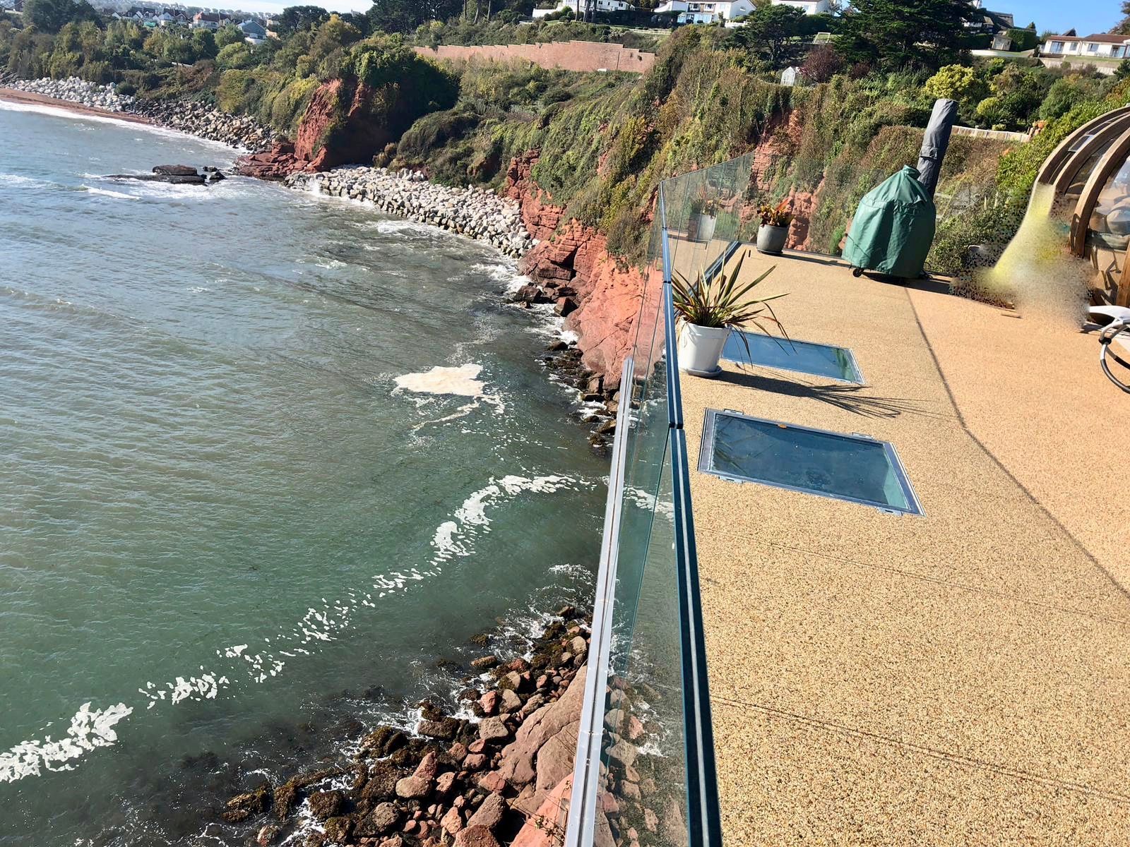 Outside, our landscaping prowess is on full display. Precisely sculpted curves meet crisp lines, defining the dimensions of this architectural marvel. A rear garden balcony offers a thrilling vantage point, with glass floor panes revealing the crashing waves below, while restored cliff-edge steps lead to the sandy shores.
